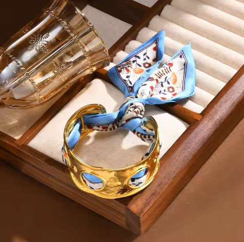 ✨ Design original : association d’une manchette dorée sculptée et d’un foulard imprimé aux couleurs vibrantes.