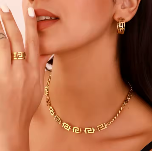 Sublimez votre allure avec notre parure Greca Dorée, une collection complète composée d’un collier, d’un bracelet, d’une bague et de boucles d’oreilles assorties. Inspirée des motifs grecs intemporels, cette parure incarne la puissance et l’harmonie dans un design chic et raffiné.